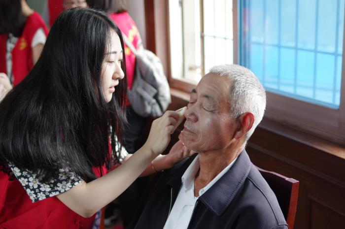5月30日早上,几对老人陆续的被我们接到影楼,在选定服装后,化妆师开始为老人们化妆。虽然几位老人都已经白发苍苍,但略施粉黛之后,依旧是容光焕发,配上头饰披上白纱,仿佛年轻了十几岁。