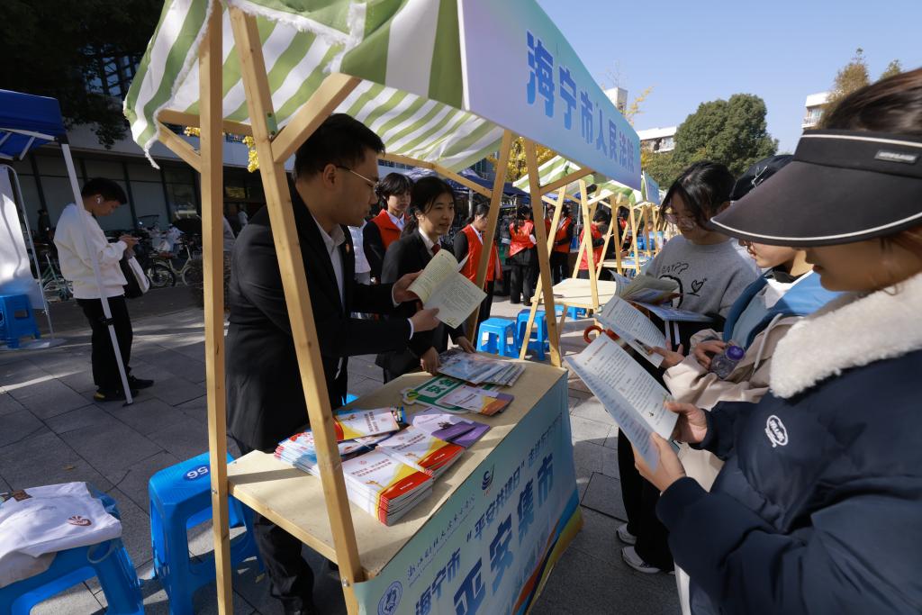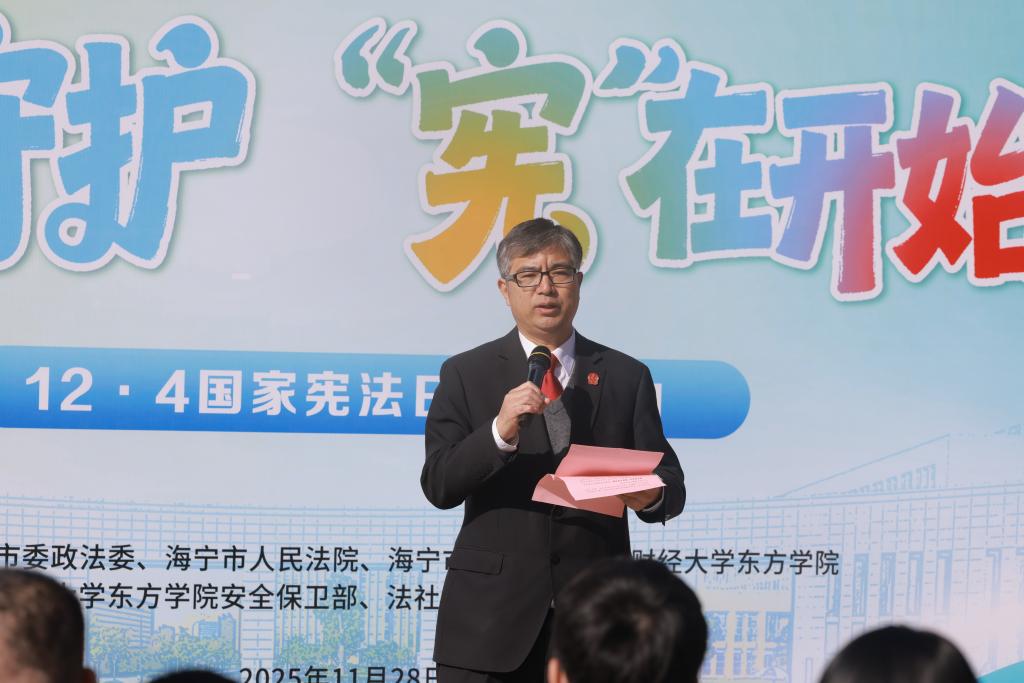 活动特邀浙江财经大学东方学院副院长张伟飚,海宁市法院审判委员会专职委员郭百顺,海宁市司法局党委委员、政治处主任王亮,海宁市委政法委平安综治督导室主任杜泽翼,浙江财经大学东方学院组织宣传部部长任海霞、团委书记宣刚、安全保卫部副部长崔艳明、法社学院党总支书记叶颖蕊、科技管理部副部长及法社学院副教授韩娟、平安驿站站长陈力警官等嘉宾出席。活动现场多元法治力量齐聚现场,与学院师生面对面交流互动,以专业视角解读宪法要义、普及法律知识,共同营造“尊崇宪法、学习宪法、遵守宪法、维护宪法、运用宪法”的浓厚校园氛围。