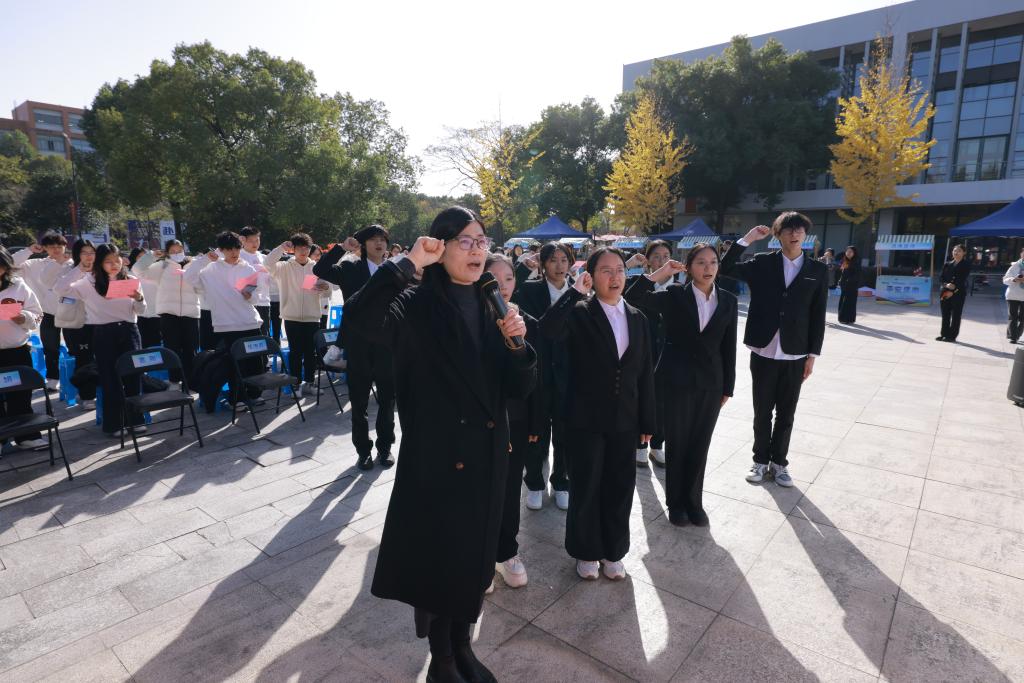 在庄重的宪法宣誓环节,由浙江财经大学东方学院科技管理部副部长、法社学院副教授韩娟担任领誓人。现场师生全体肃立致敬,右手举拳,在领誓人的带领下庄严诵读宪法誓词。铿锵有力的誓言在校园上空回荡,充分展现了师生对宪法的崇高敬意和恪守法治的坚定决心。