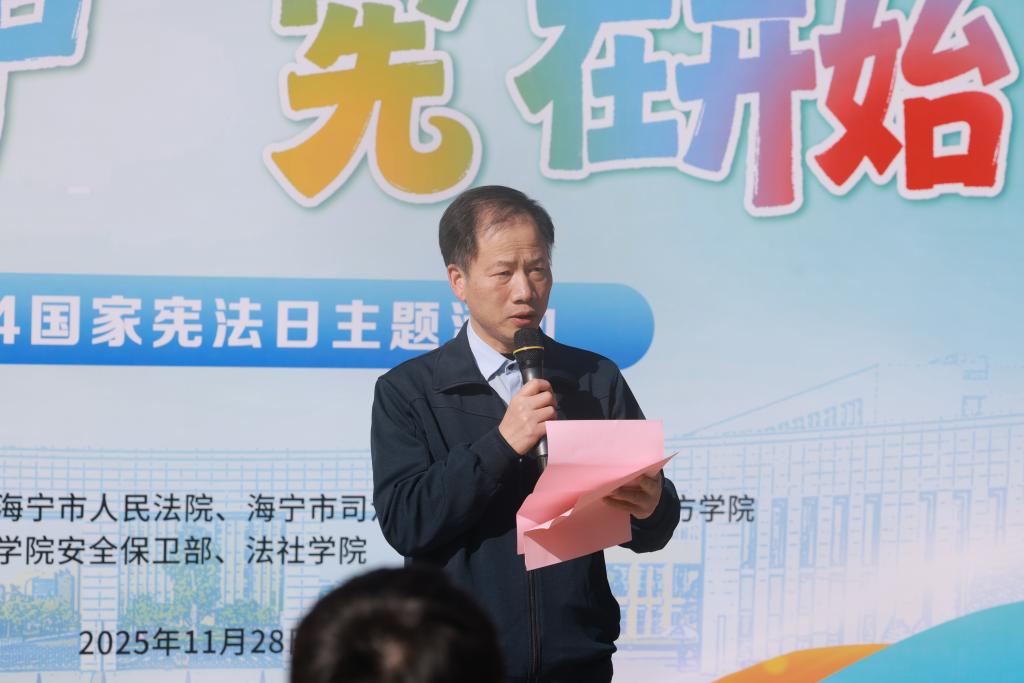 随后,海宁市法院审判委员会专职委员郭百顺系统阐述了开展宪法宣传活动的目的与意义,向同学们提出“与宪法同行、将法治融入日常”的实践倡议。他着重强调宪法作为国家根本大法,具有最高法律效力,鼓励大学生既要深刻领会宪法精神、做到内化于心,更要主动践行宪法要求、实现外化于行。