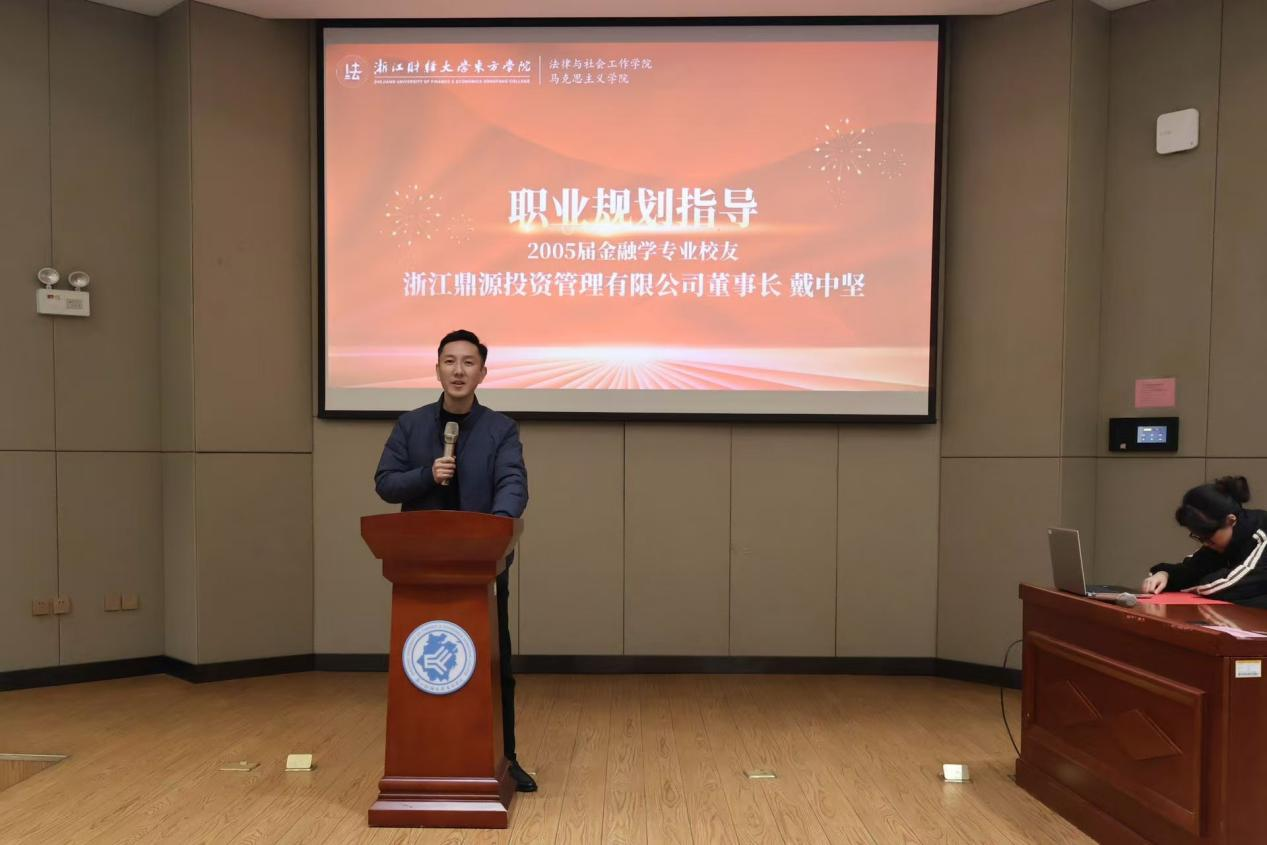 随后,优秀校友戴中坚围绕职业规划开展专题讲座。他结合自身执业经历与行业观察,强调法学学子应拓宽视野,注重跨学科融合,实现全面发展。