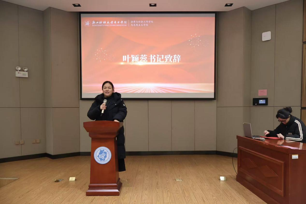 法社学院党总支书记叶颖蕊上台致辞。她首先对校友的到来表示欢迎,感谢鼎源奖学金对学院发展的支持,并向所有通过国家统一法律职业资格考试的同学表示祝贺。她勉励获奖学子继续发挥榜样作用,同时鼓励全体同学脚踏实地、奋发前行。