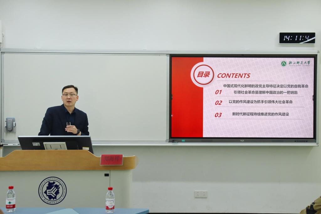 专题分享环节,郑海祥老师紧扣主题,从历史逻辑、理论内涵、实践路径三个维度展开系统深入讲解。郑老师强调,中国式现代化具有鲜明的政党主导特征,以党的自我革命引领伟大社会革命,是总结百年党史得出的重要结论,也是推进新时代伟大社会革命的必由之路。他系统回顾了党的作风建设百年历程:在民主革命时期,重点阐释了延安整风运动的重大意义,指出延安整风开创了以整风方式加强作风建设的成功范例,铸就了理论联系实际、密切联系群众、批评与自我批评三大优良作风,为党走向成熟奠定了坚实基础;在改革开放新时期,介绍了党的十一届三中全会重新确立实事求是的思想路线,以及1983年全面整党在统一思想、整顿党风、纯洁组织方面的重要作用;在中国特色社会主义新时代,郑老师详细解读了中央八项规定的出台背景与实践成效,指出八项规定是新时代全面从严治党的“徙木立信”之举,十余年驰而不息,推动党风政风、社风民风焕然一新。