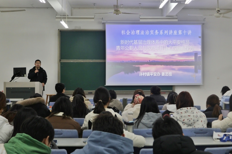 12月18日晚,社会治理法治实务系列讲座第10讲——《新时代基层治理体系中的“大平安”格局:青年公职人员与政府项目社工的担当》顺利举行。本次讲座延续系列论坛对基层治理与法治实践的关注,聚焦于“大平安”理念在基层的落地与实践,邀请到了来自许村镇平安法治办的姜艺恒主任以及海宁市红太阳社工事务所的仇梦强、沈梦蝶两位禁毒社工共同分享经验、展开对话。讲座由社会工作系主任舒振宇老师主持,社会工作专业学生近百人参与。