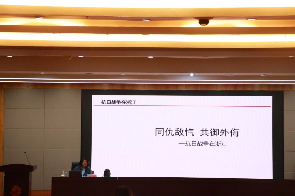 讲座伊始,谢庆梅老师通过具体的事实案例,列举日军入侵浙江以来犯下的累累罪行,并详细深入地介绍了浙江抗日民族统一战线的建立与发展。1938年,《浙江省战时政治纲领》的颁布,使抗战初期的浙江有了一个为国共两党所共同遵守的政治基础;1939年,中共中央军委副主席周恩来来到浙江视察抗战,重申抗日统一战线之大计,促成了精诚团结、一致抗日的团结局面。此外,抗日民族统一战线还促成了抗日救亡运动在各领域的开展,激发了成千上万人民的爱国热情与战斗意志。