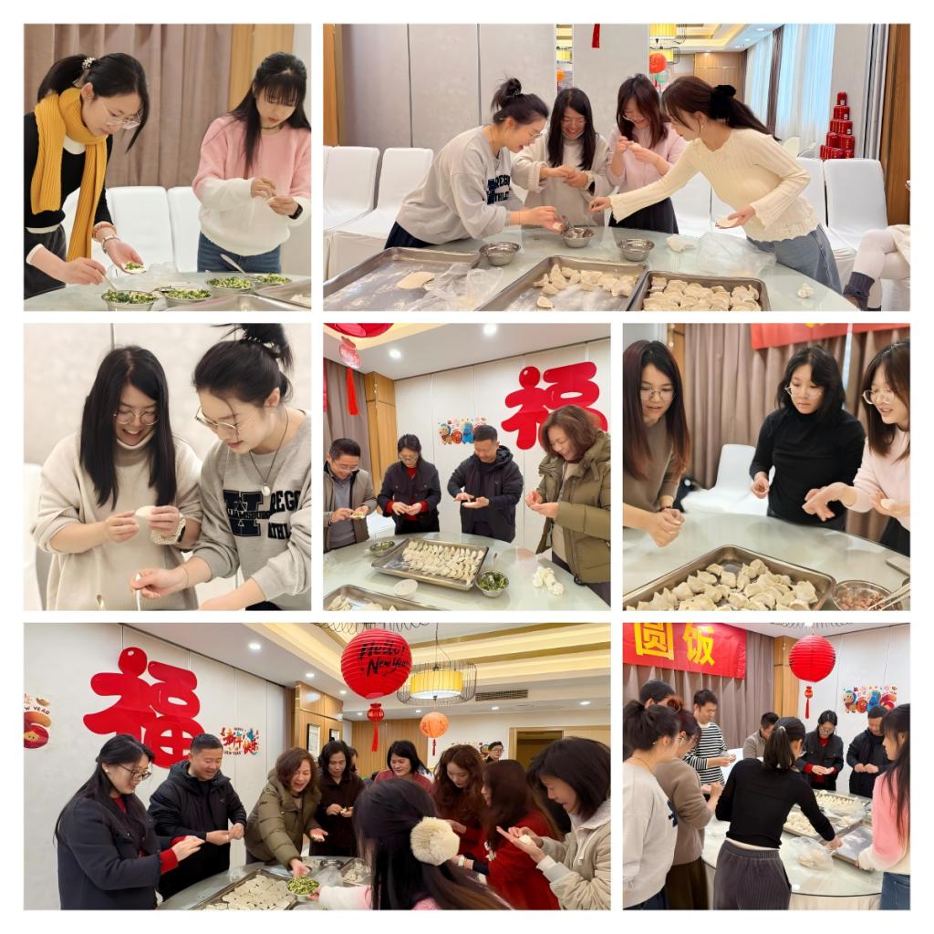 当然,团圆饭最不可或缺的,就是象征团圆的饺子。餐厅地准备了两种馅料和饺子皮,老师们围在大圆桌旁,大展身手。有的老师手法娴熟,捏出的饺子个个肚儿圆圆,精神饱满;有的老师虽然是新手,但在大家的笑声和指导中,也包出了“创意作品”。大家包饺子,聊家常,分享工作趣事和生活点滴。空气中弥漫的,不仅是面粉与馅料的香气,更是家人闲坐、灯火可亲的温暖。为了增加趣味,我们还在饺子中悄悄包入了10枚“幸运硬币”,期待着哪位幸运儿能在午宴时收获这份“财运”。